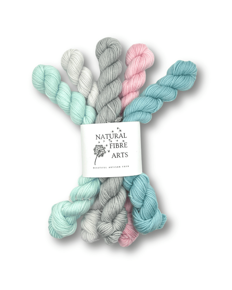 Discover the magic of winter with this enchanting bundle of five mini skeins in the softest icy hues. Featuring pristine white, delicate pastel pink, cool icy blue, refreshing mint green, and soothing misty grey, this collection is perfect for festive projects, colour-blocking, or adding seasonal touches to your creations. Ideal for gifting or treating yourself to a palette of inspiration this holiday season.